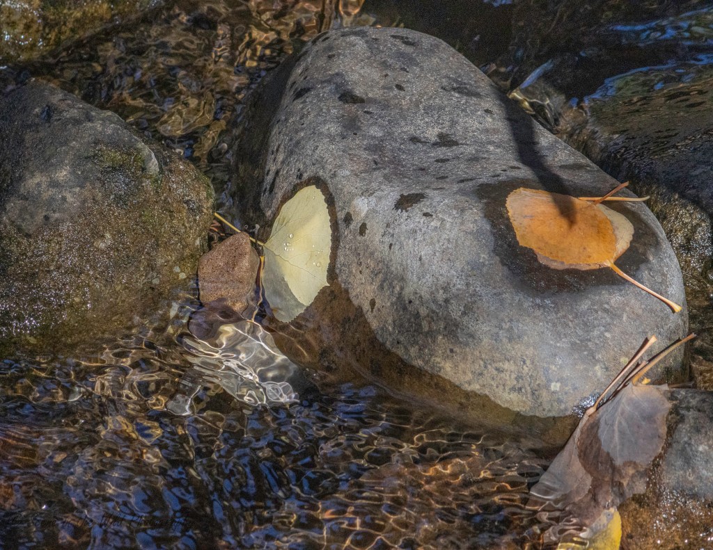 Aspen leaves in stream, Oct. 21, 2025