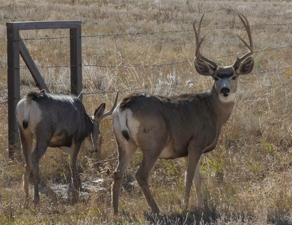 Mule deer bucks by road to Lake DeWeese, Oct. 20,2025